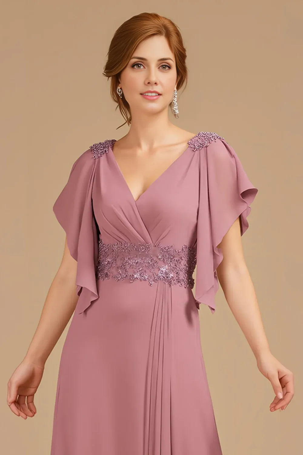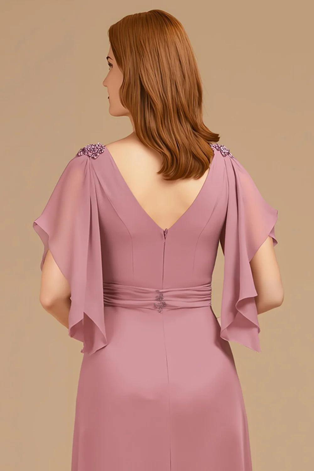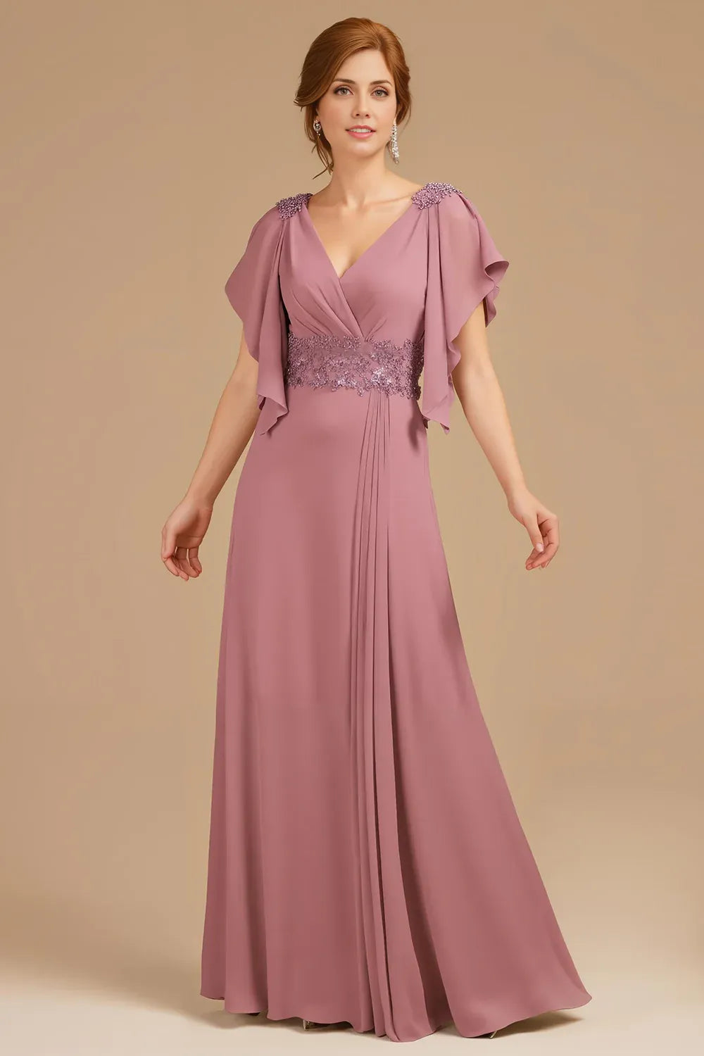 Chic A Line V-Neck Flutter Sleeve Zipper Up Floor-Length Mother of the Bride Dress
