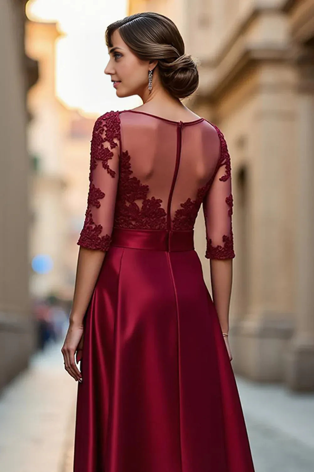 weitese's Elevate your formal look with this burgundy lace and satin maxi dress. It features an intricate lace bodice with sheer 3/4 sleeves for elegant allure, a luxurious satin skirt for opulent charm, and a tailored waistband for refined detail. The sheer back adds a touch of modern drama, making it perfect for weddings, evening galas, or any occasion where you want to showcase timeless sophistication with a blend of delicate lace and glamorous satin.