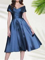 weitese's Elevate your formal style with this navy blue off-shoulder satin midi dress. It features a sophisticated cross-front bodice that flatters the neckline, an A-line silhouette with a voluminous skirt for graceful movement, and an alluring open back design. Crafted from luxurious satin fabric, this midi-length dress is perfect for weddings, cocktail parties, or any special occasion where you want to make a refined statement. Pair it with metallic heels and delicate earrings to complete a timeless, glamorous look.
