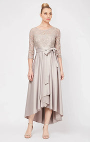 weitese's Elevate your elegant charm with this champagne lace high-low midi dress. It features intricate lace detailing on the bodice for subtle sophistication, a satin tie waist that defines the silhouette, and 3/4 sleeves for refined coverage. The high-low midi length makes it perfect for formal events, weddings, or any occasion where you want to embrace timeless, polished style.