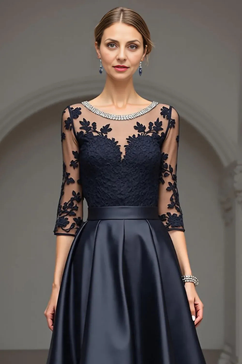 weitese's Elevate your semi-formal look with this navy blue lace and satin high-low midi dress. It features an intricate lace bodice with sheer 3/4 sleeves for elegant allure, a luxurious satin high-low skirt for dramatic movement, and an embellished neckline for refined charm. The open back adds a touch of modern drama, making it perfect for cocktail parties, weddings, or any occasion where you want to showcase sophistication with a blend of delicate lace and glamorous satin.