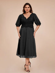 Elegant A Line V-neck Half Lantern Sleeves Chiffon Tea-Length Plus Size Mother of the Bride Dress
