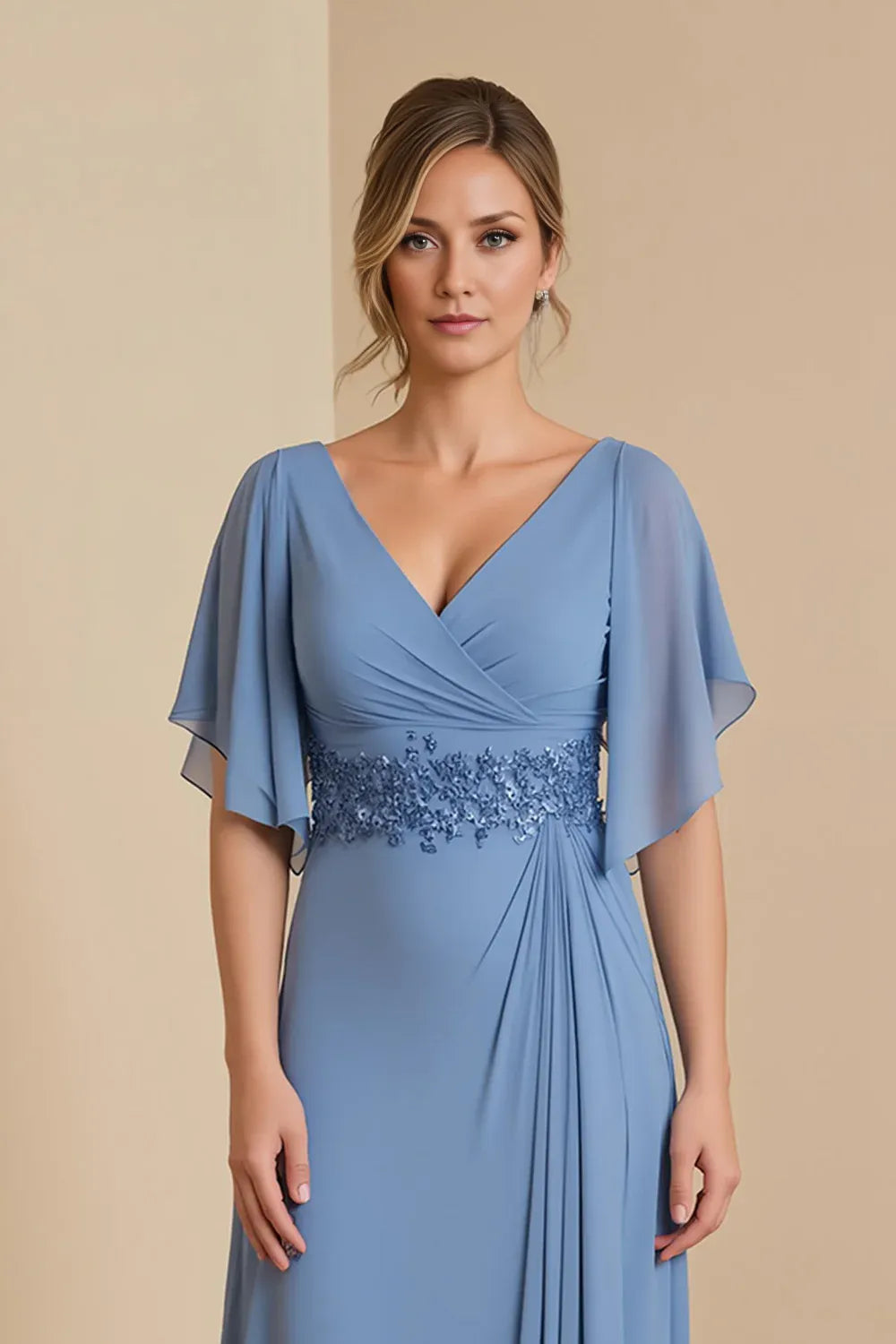 weitese's Elevate your formal look with this light blue chiffon maxi dress. It features flutter sleeves for elegant allure, a deep V-neckline for refined charm, and an embellished waistband for glamorous detail. The flowing chiffon fabric ensures a timeless appearance, making it perfect for weddings, evening galas, or any occasion where you want to showcase sophistication with a touch of feminine grace.