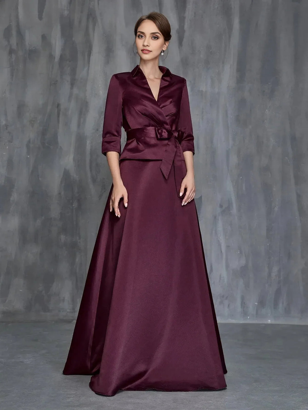 weitese's Elevate your sophisticated allure with this burgundy satin wrap-style maxi dress. It features lustrous satin fabric with a shirt collar and wrap-front detailing for opulent allure, 3/4 sleeves for refined charm, and a belted waist with a bow accent for sophisticated flair. The rich burgundy hue ensures a timeless finish, making it perfect for formal events, mother-of-the-bride occasions, or any gathering where you want to blend classic tailoring with elegant, polished design.