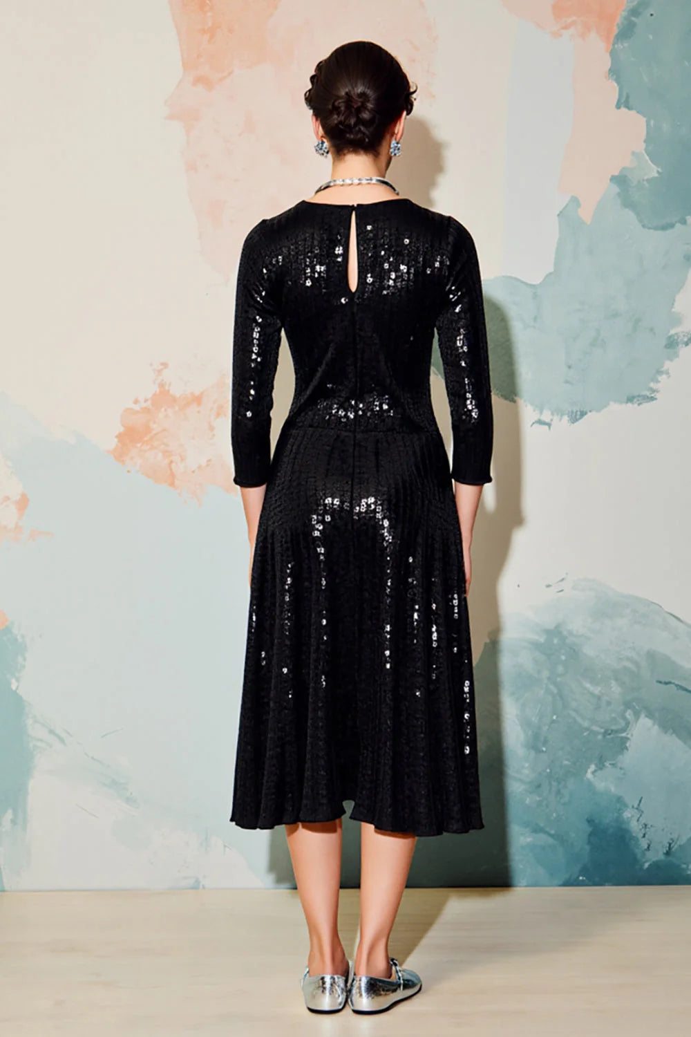 weitese's Elevate your formal look with this black sequin midi dress. It features all-over sequin embellishments for glamorous shine, 3/4 sleeves for refined charm, and a round neck design for classic allure. The keyhole back adds a touch of modern detail, while the flared skirt offers graceful movement. Perfect for cocktail parties, evening events, or any occasion where you want to showcase timeless sophistication with a blend of sparkling sequins and tailored design.