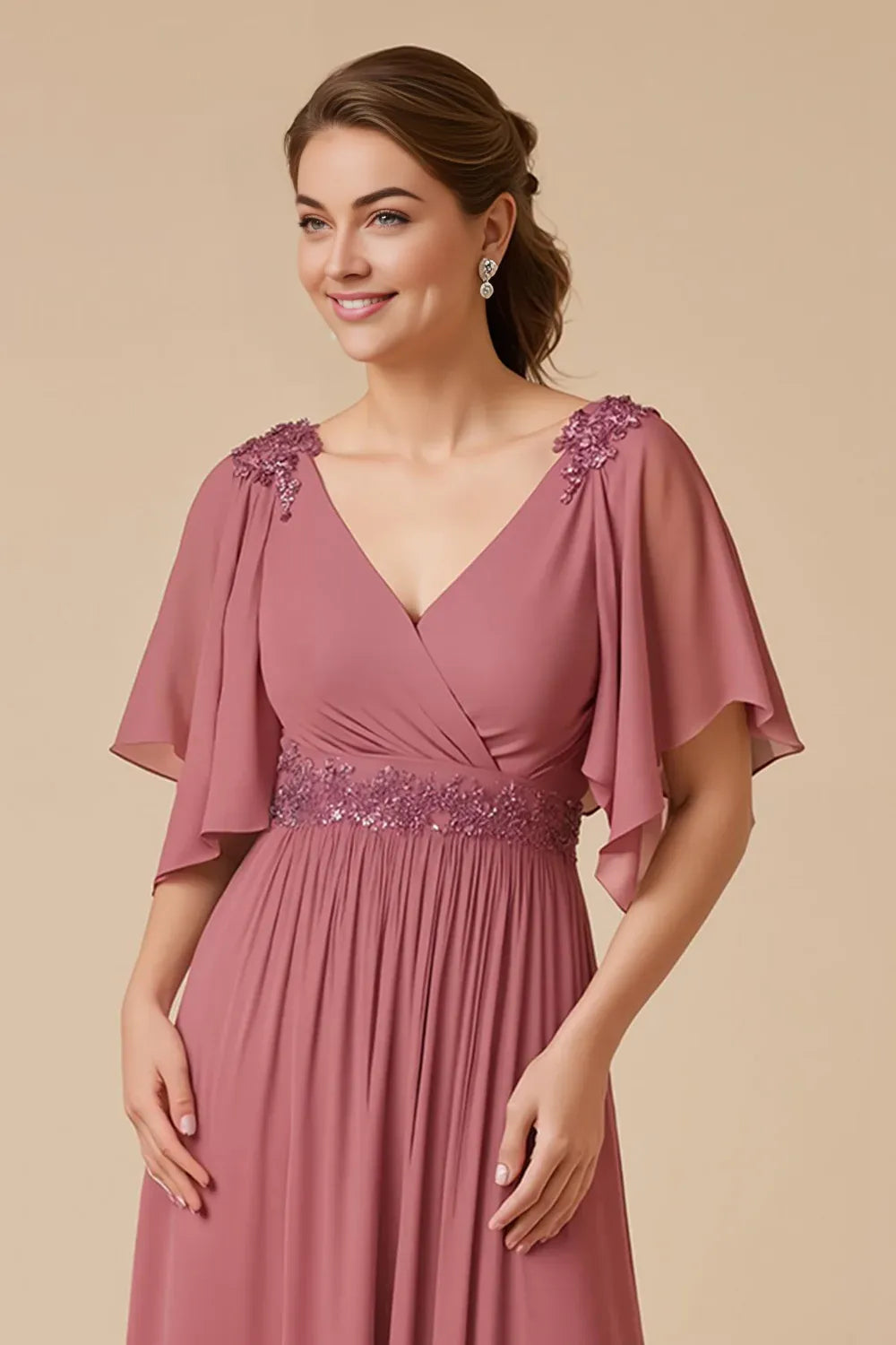 weitese's Elevate your formal look with this dusty rose chiffon maxi dress. It features a lightweight chiffon fabric for graceful movement, an embellished V-neck design with ruffled sleeves for elegant allure, and a beaded waist for refined charm. The flowing skirt offers timeless style, making it perfect for weddings, evening galas, or any occasion where you want to showcase sophistication with a blend of airy chiffon and subtle embellishment.