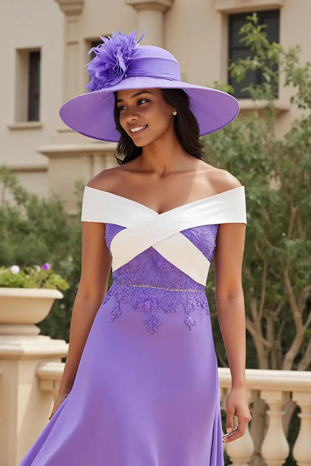 weitese's Elevate your formal look with this lilac and white off-shoulder high-low gown. It features an off-shoulder design with a white contrast bodice for elegant charm, intricate lace detailing for sophisticated glamour, and a high-low hem for graceful movement. The flowing fabric ensures comfort and a striking silhouette, making it perfect for weddings, garden parties, or any occasion where you want to showcase bold color contrast with timeless sophistication.