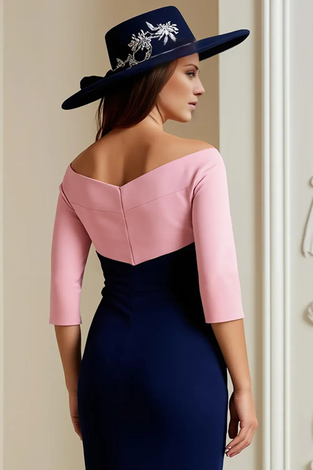 weitese's Elevate your formal look with this navy blue and pink off-shoulder midi dress. It features a color-block design for modern charm, an off-shoulder neckline with 3/4 sleeves for elegant allure, and floral embroidery for refined detail. The tailored silhouette provides a flattering fit, making it perfect for weddings, cocktail parties, or any occasion where you want to showcase timeless sophistication with a blend of bold color blocking and delicate embroidery.