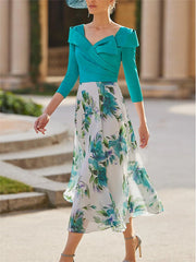 Weitese Dress A-Line Two Piece Wedding Guest Elegant Vintage V Neck Tea Length Chiffon 3/4 Length Sleeve With Bow(s) Ruched Flower Wedding Guest Dress Mother of the Bride Dress