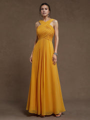 weitese's Elevate your vibrant look with this mustard yellow chiffon maxi dress. It features flowing chiffon fabric for graceful allure, a crisscross halter neckline with a ruched back for refined charm, and an A-line silhouette for sophisticated flair. The bold mustard yellow hue ensures a standout finish, making it perfect for formal events, weddings, or any occasion where you want to blend classic elegance with a lively, textural design.