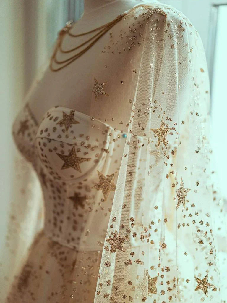 Champagne A line tulle long prom dress tulle Star long formal evening dress