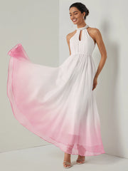 weitese's Elevate your ethereal look with this white to pink ombre chiffon maxi dress. It features flowing ombre chiffon fabric for dreamy allure, a crystal-embellished halter neck with a keyhole detail for refined charm, and an A-line silhouette for sophisticated flair. The gradient color transition ensures a standout finish, making it perfect for formal events, weddings, or any occasion where you want to blend delicate elegance with artistic, textural design.