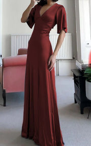 Charming Deep V Neck Evening Prom Dresses with Short Sleeve