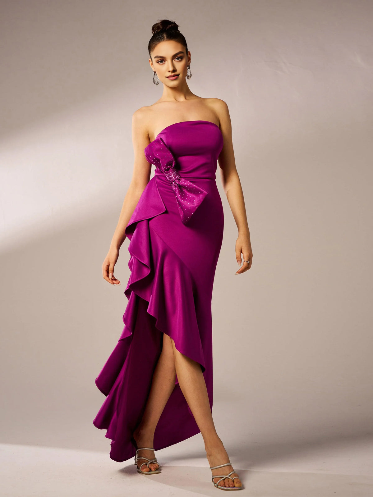 weitese's Elevate your chic elegance with this magenta satin strapless asymmetrical midi dress. It features lustrous satin fabric for opulent allure, a strapless neckline with an embellished bow accent for refined charm, and an asymmetrical ruffled skirt for playful, sophisticated flair. The vibrant magenta hue ensures a standout finish, making it perfect for cocktail parties, formal events, or any occasion where you want to blend modern style with luxurious, textural design.