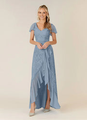 weitese's Elevate your elegant look with this dusty blue lace maxi dress. It features intricate lace detailing throughout for romantic allure, flutter sleeves for delicate charm, and a chiffon overlay with a high-low hem for dynamic flair. The V-neckline and back design add refined sophistication, making it perfect for formal events, bridesmaid duties, or any occasion where you want to blend soft color with luxurious design.