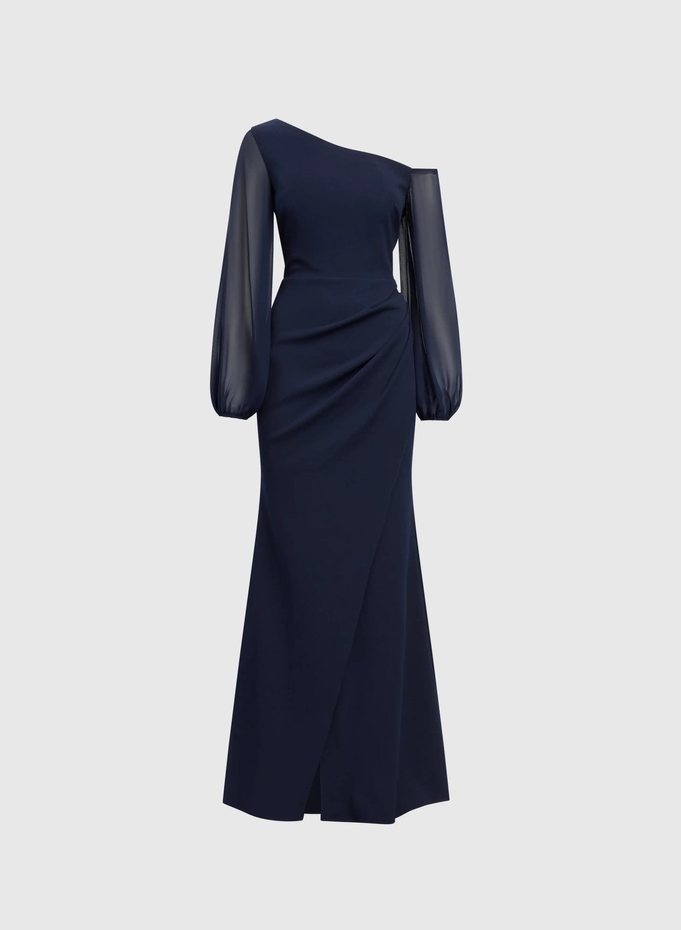 weitese's Elevate your sophisticated allure with this navy blue one-shoulder gown. It features a sleek bodice with a one-shoulder neckline and sheer chiffon balloon sleeve for opulent charm, a draped asymmetric skirt with high slit for refined elegance, and a fitted silhouette that adds a touch of polished flair. The deep navy hue ensures a captivating finish, making it perfect for formal events, galas, or any occasion where you want to embrace timeless luxury with show-stopping style.