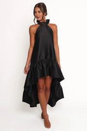 weitese's Elevate your avant-garde allure with this black satin halter high-low dress. It features luxurious satin fabric with a halter neckline that accentuates the shoulders, ruffle details for dramatic movement, and an open back for bold charm. The high-low hemline makes it perfect for fashion-forward events, evening parties, or any occasion where you want to embrace unique, show-stopping style.