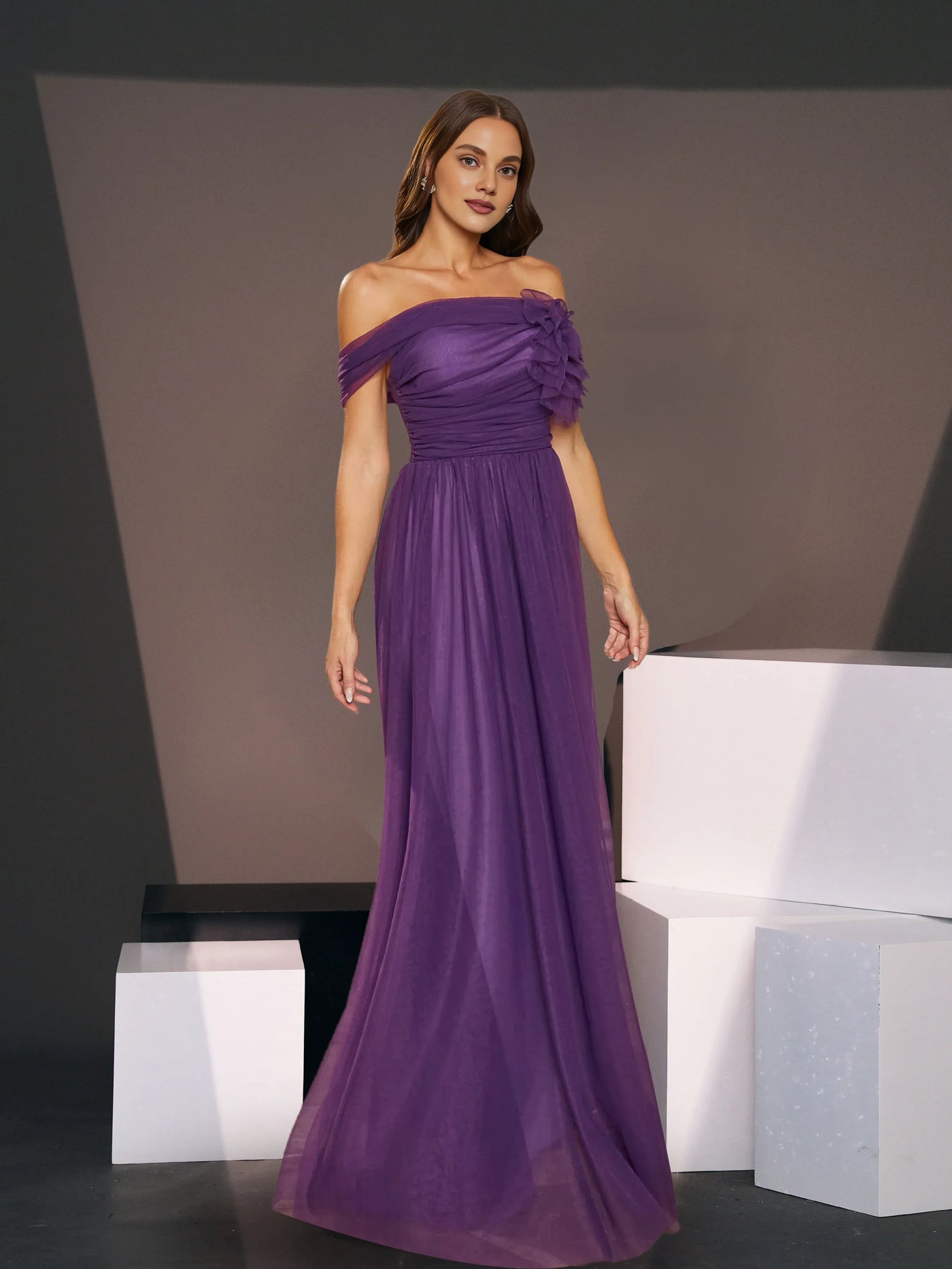 weitese's Elevate your romantic look with this plum purple off-shoulder tulle maxi dress. It features flowing tulle fabric for opulent allure, an off-shoulder neckline with a delicate 3D floral detail for refined charm, and a soft A-line silhouette for sophisticated flair. The rich plum purple hue ensures a standout finish, making it perfect for formal events, weddings, or any occasion where you want to blend whimsical elegance with textural, feminine design.