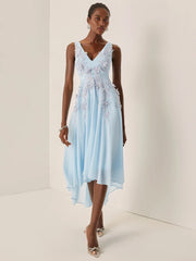 weitese's Elevate your romantic look with this light blue chiffon high-low midi dress. It features flowing chiffon fabric for graceful allure, a deep V-neckline with intricate 3D floral lace embroidery for refined charm, and a high-low silhouette for sophisticated flair. The soft light blue hue ensures a versatile finish, making it perfect for formal events, weddings, or any occasion where you want to blend classic elegance with delicate, textural design.