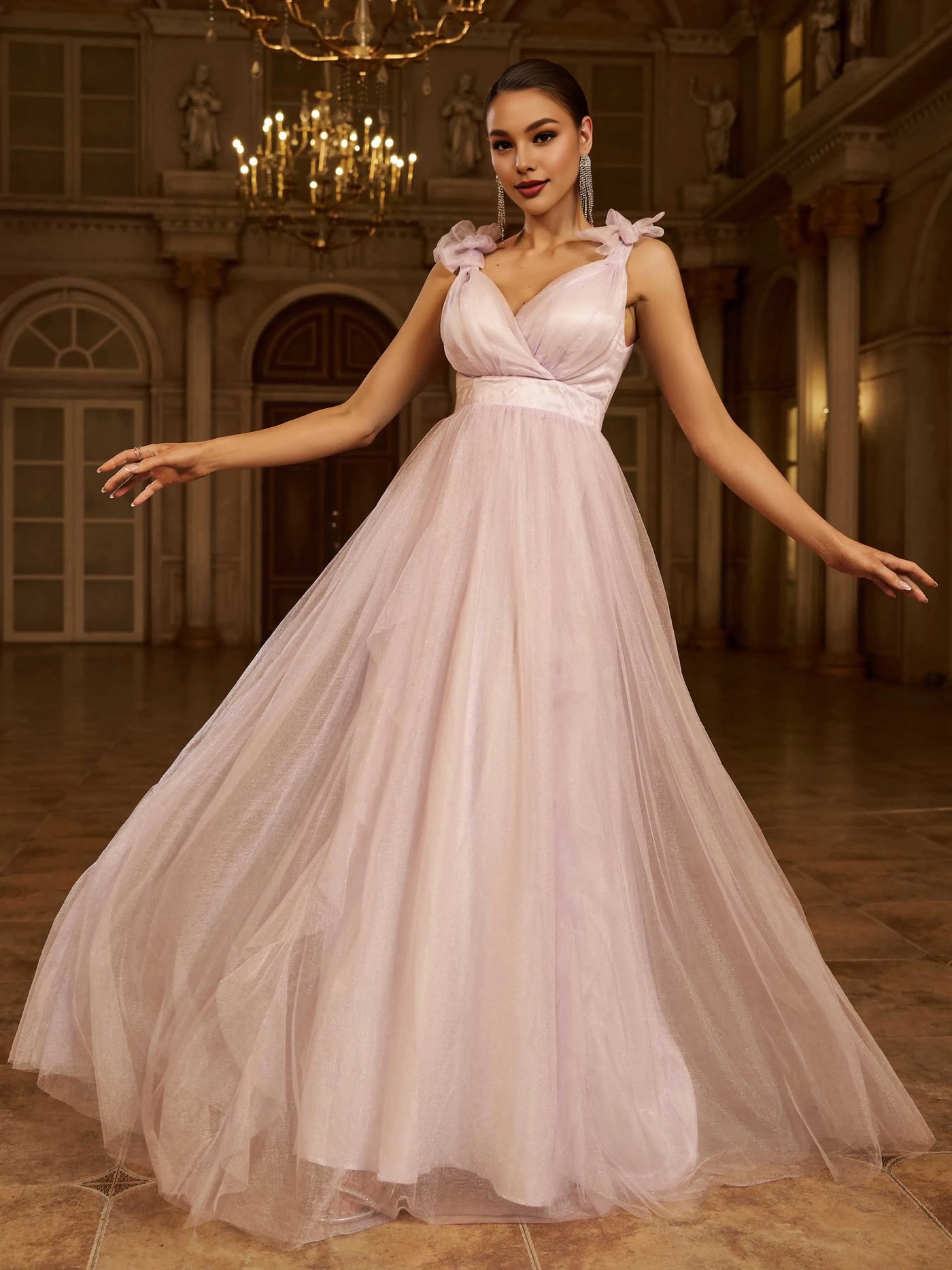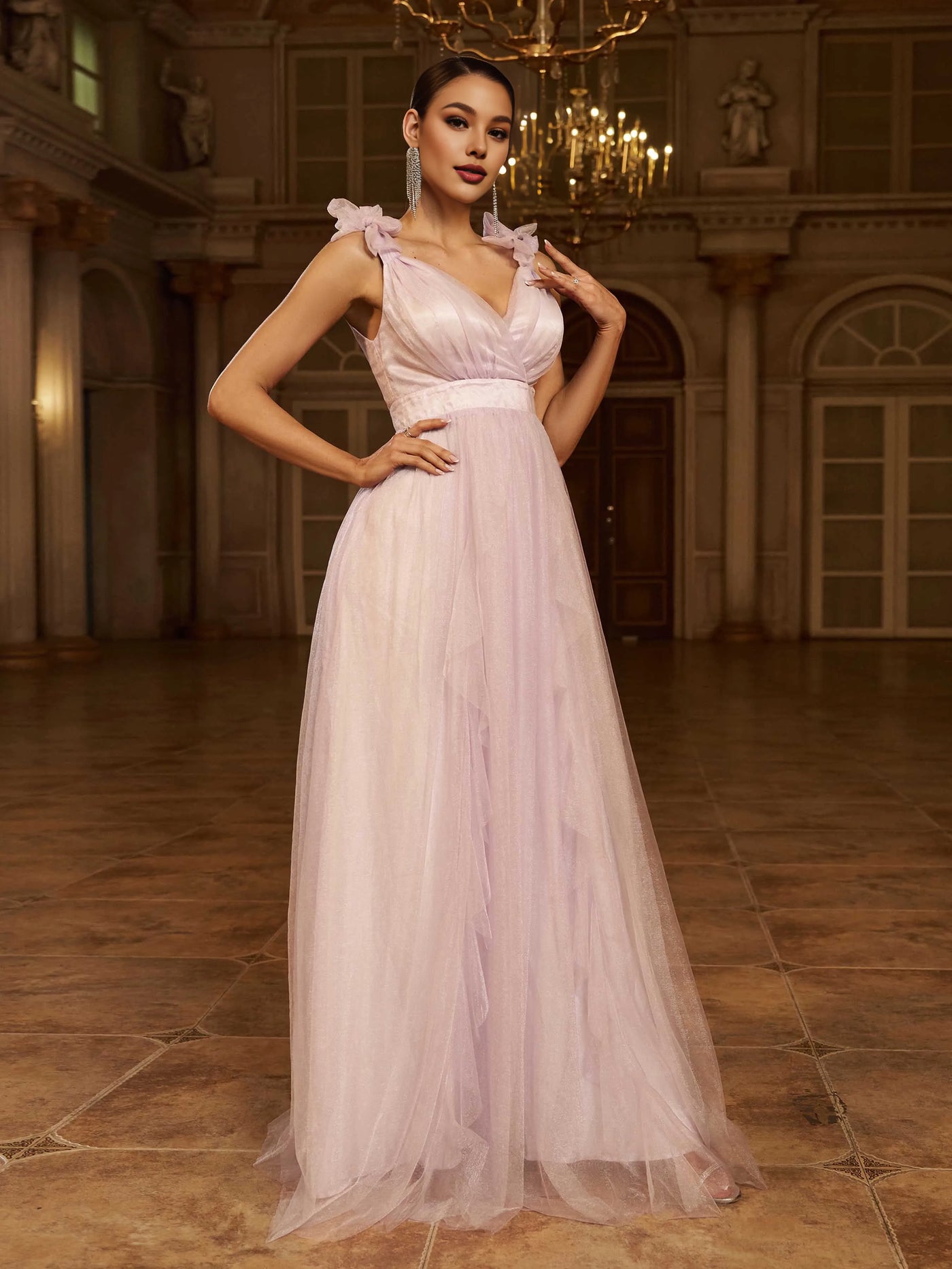 weitese's Elevate your romantic elegance with this tulle maxi dress. It features layers of ethereal tulle fabric for opulent allure, bow-accented straps with a plunging V-neckline (front and back) for refined charm, and a voluminous A-line skirt for sophisticated flair. The soft lilac hue ensures a dreamy finish, making it perfect for formal events, weddings, or any occasion where you want to blend timeless grace with whimsical, textural design.