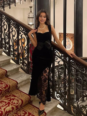 weitese's Elevate your elegant look with this black velvet and lace mermaid maxi dress. It features a plush velvet bodice with square neckline and bow detail for romantic allure, a side lace slit for refined charm, and a figure-hugging mermaid silhouette for sophisticated flair. The combination of rich velvet and delicate lace ensures a polished finish, making it perfect for formal events, weddings, or any occasion where you want to blend timeless black with luxurious texture and detailing.