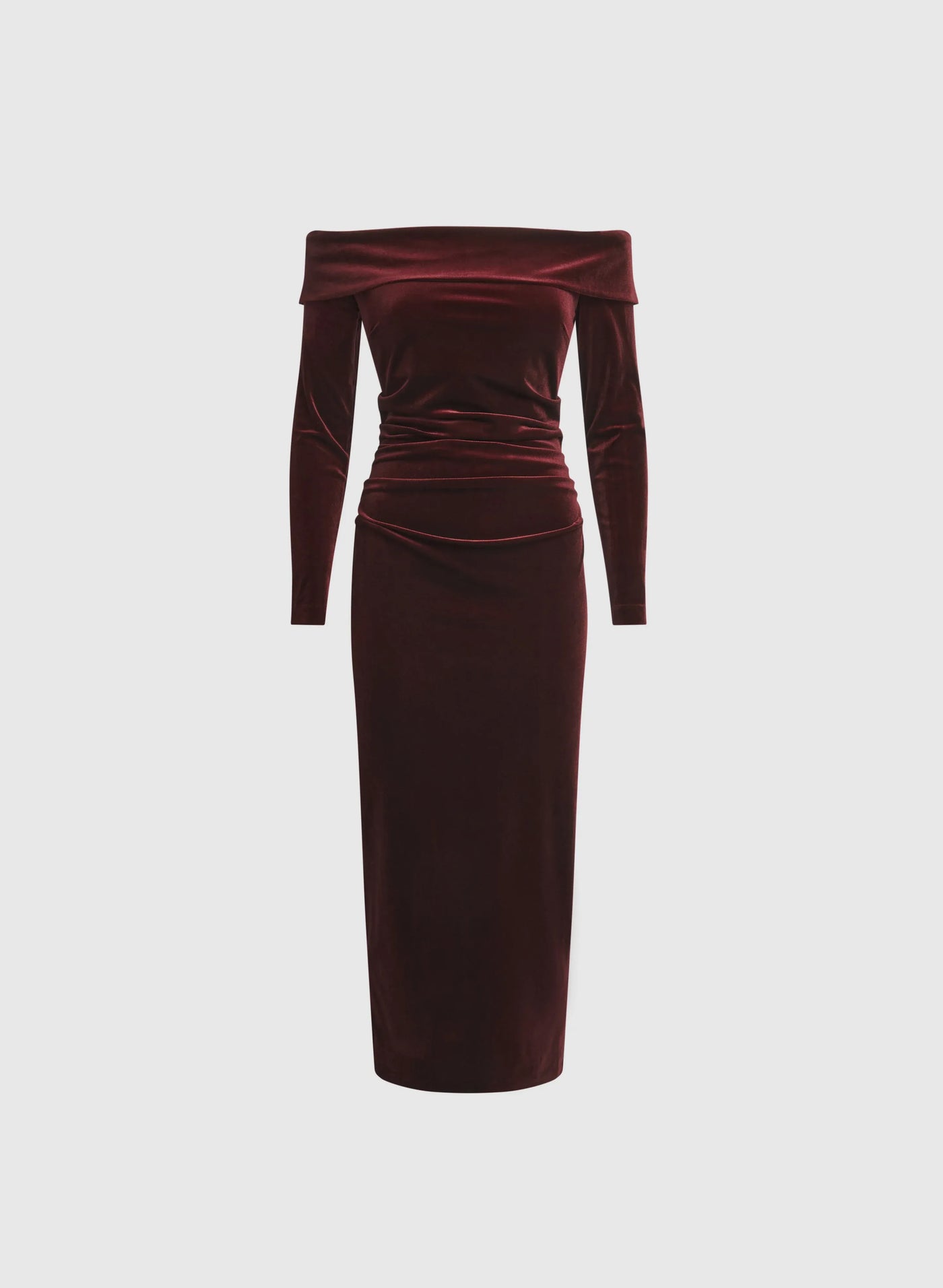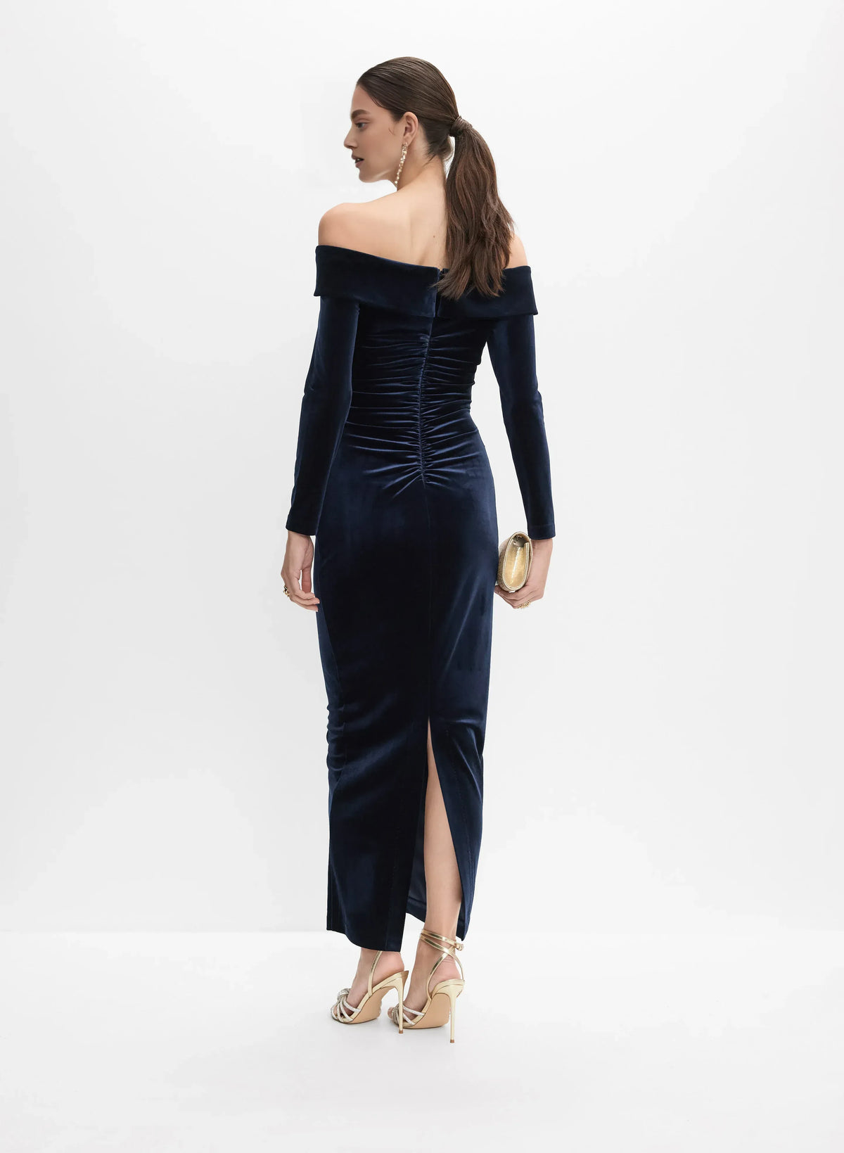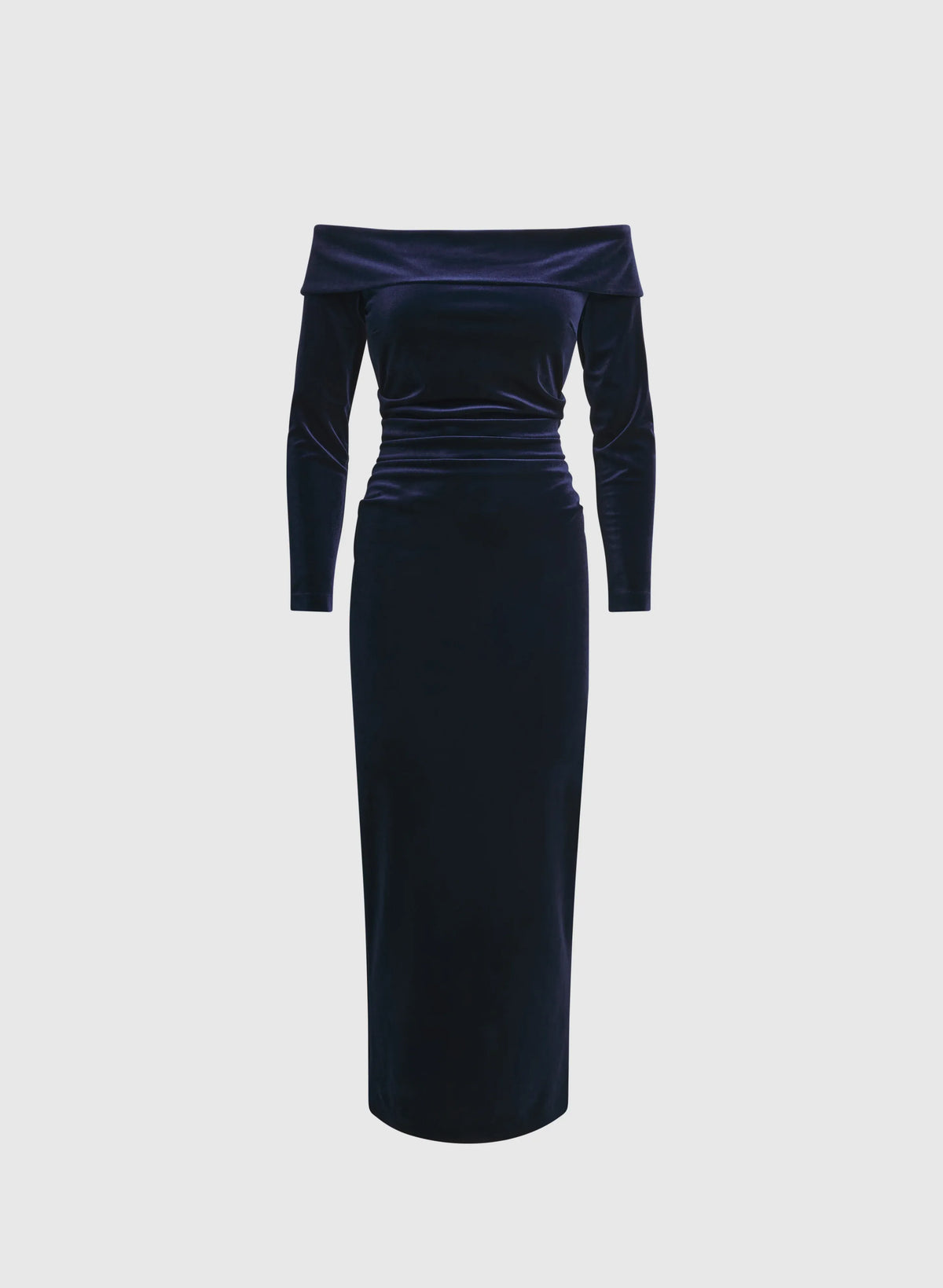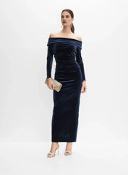 weitese's Elevate your sophisticated allure with this navy blue off-shoulder velvet midi dress. It features luxurious velvet fabric with an off-shoulder neckline and long sleeves for opulent charm, a ruched bodice and fitted silhouette for refined elegance, and a back slit detail that adds a touch of polished flair. The rich navy hue ensures a versatile finish, making it perfect for formal events, cocktail parties, or any occasion where you want to embrace timeless luxury with elegant, show-stopping style.