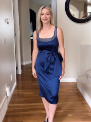 weitese's Elevate your sophisticated look with this navy blue satin midi dress. It features lustrous satin fabric for opulent allure, a crystal-embellished square neckline for refined charm, and an oversized bow detail at the waist with a sheath silhouette for sophisticated flair. The deep navy blue hue ensures a versatile finish, making it perfect for formal events, cocktail parties, or any occasion where you want to blend classic elegance with luxurious, textural design.