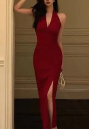 Halter Deep V Neck Sheath Long Prom Dress With Slit