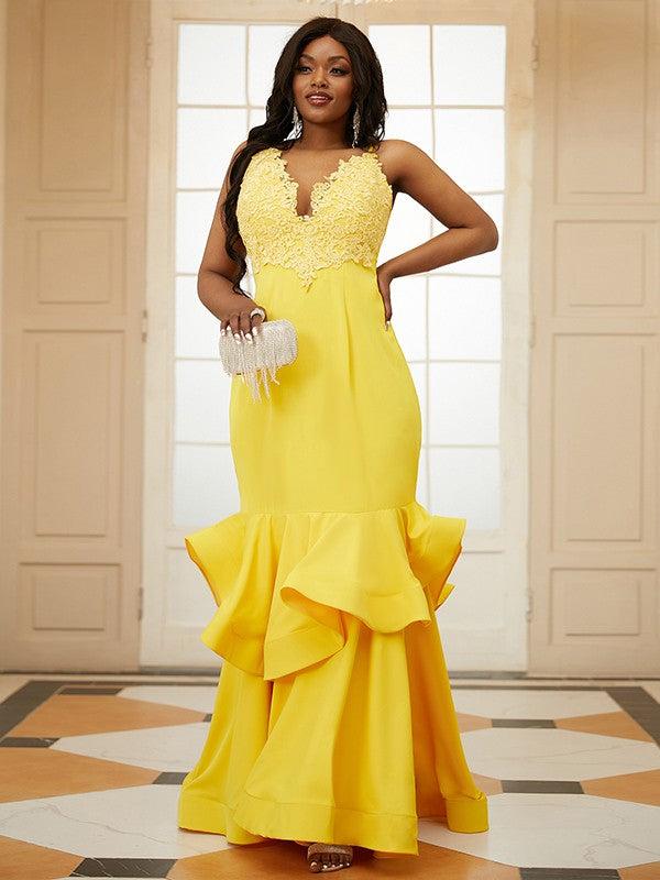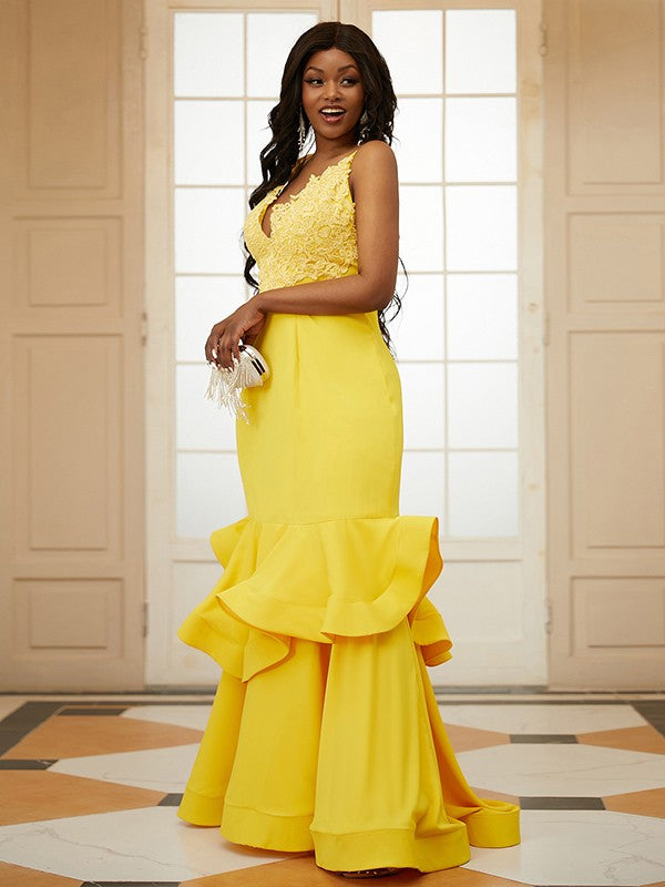 Trumpet/Mermaid Jersey Applique V-neck Sleeveless Sweep/Brush Train Dresses