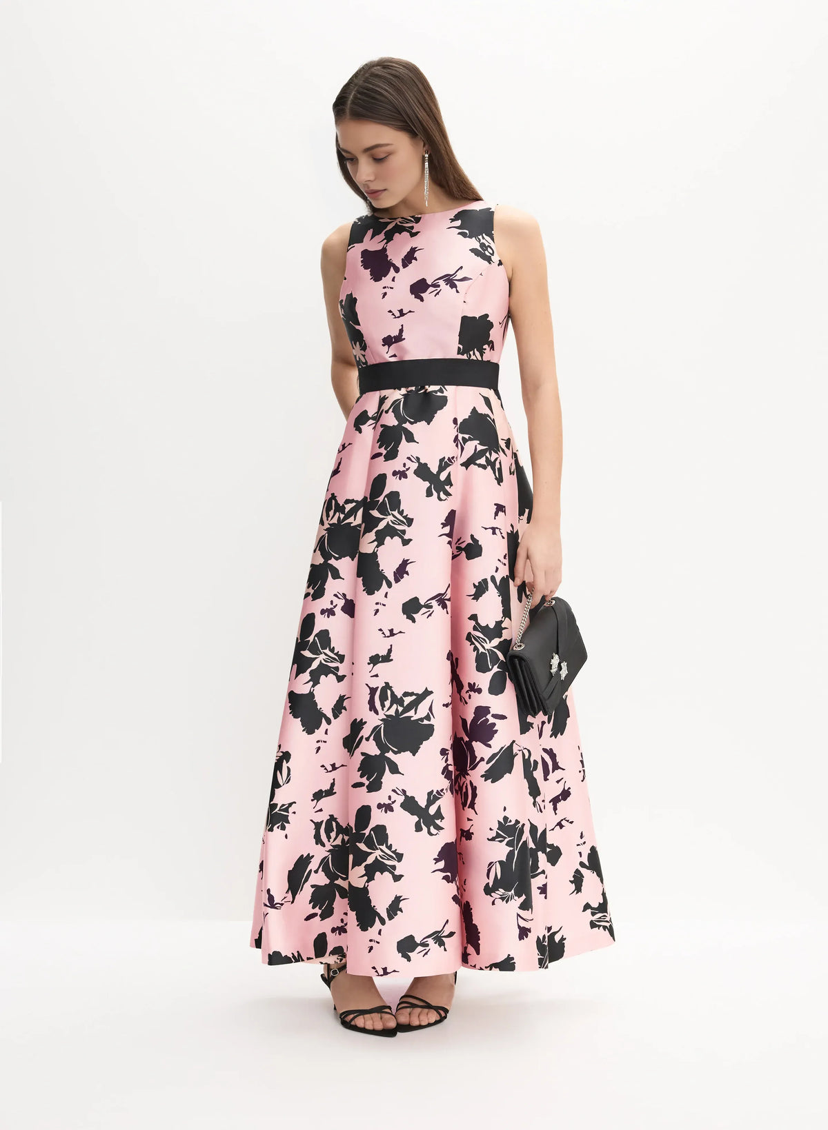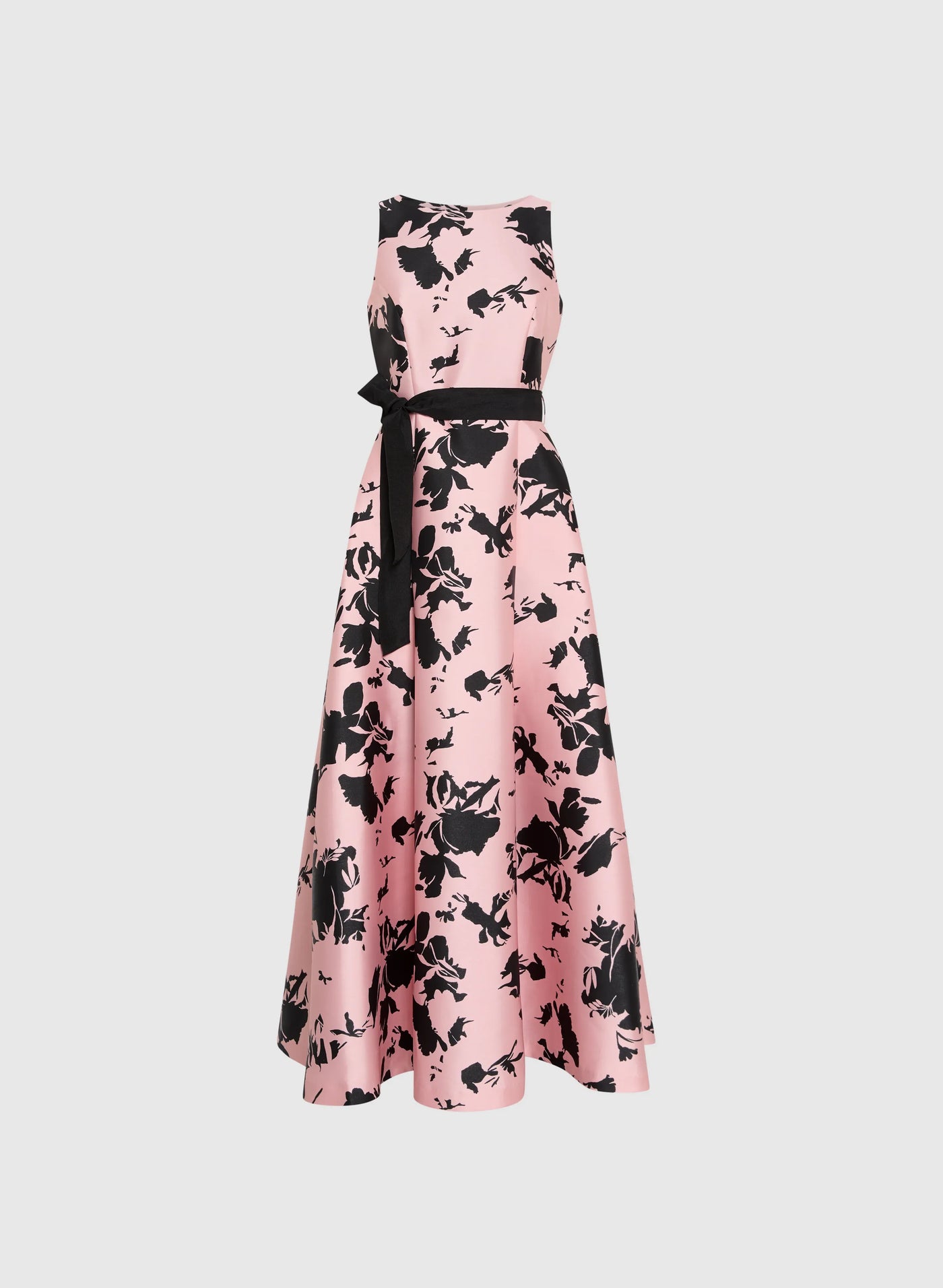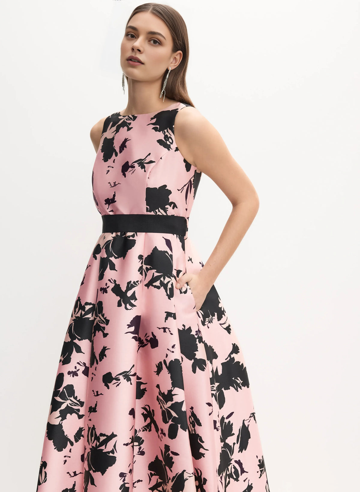 weitese's Elevate your elegant allure with this pink and black floral satin A-line gown. It features lustrous satin fabric with a bold floral print for opulent charm, a contrast black belt with bow detail that defines the waist, and an A-line silhouette that offers refined grace. The vibrant pink and classic black combination ensures a captivating finish, making it perfect for formal events, weddings, or any occasion where you want to embrace timeless luxury with a playful, show-stopping style.