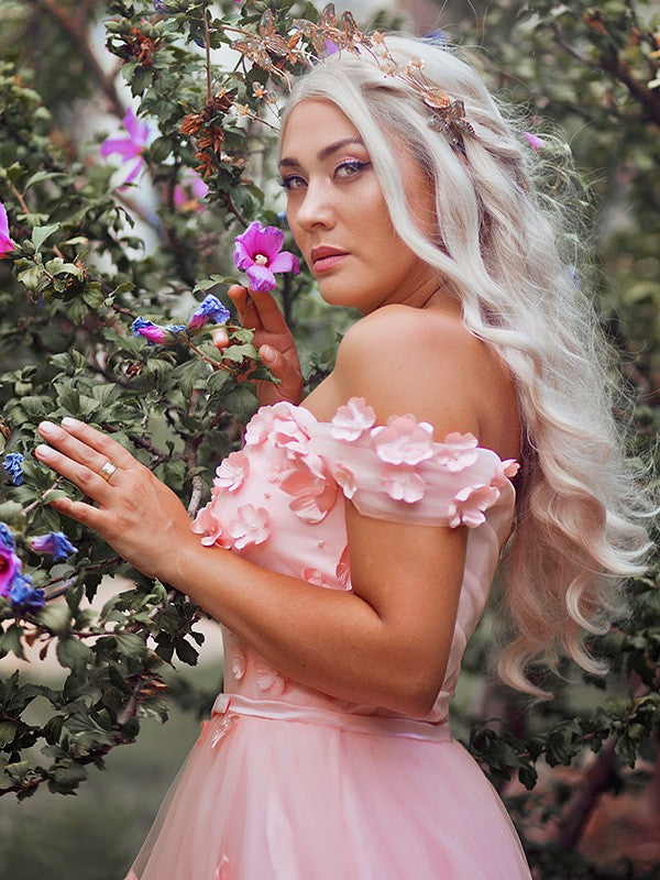 A-Line/Princess Off-the-Shoulder Applique Tulle Sleeveless Floor-Length Dresses