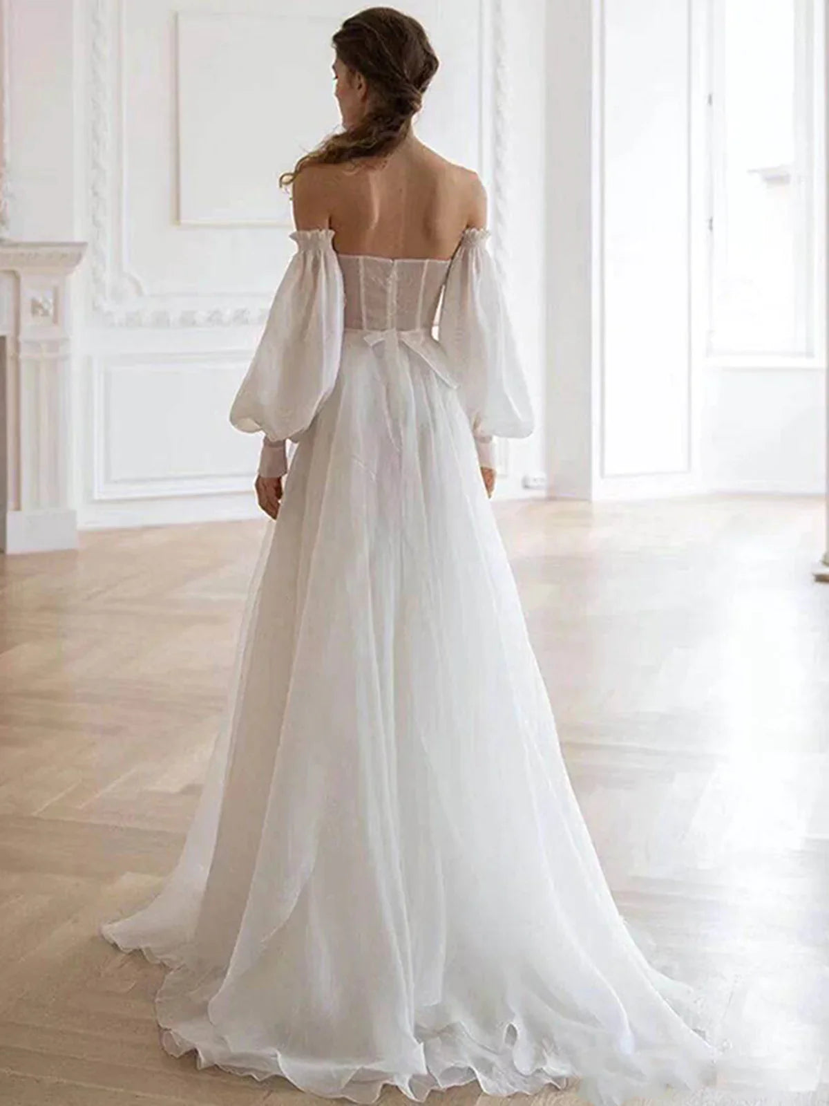 Off-the-Shoulder Floor Length A line White Long Prom Dress With Sleeve