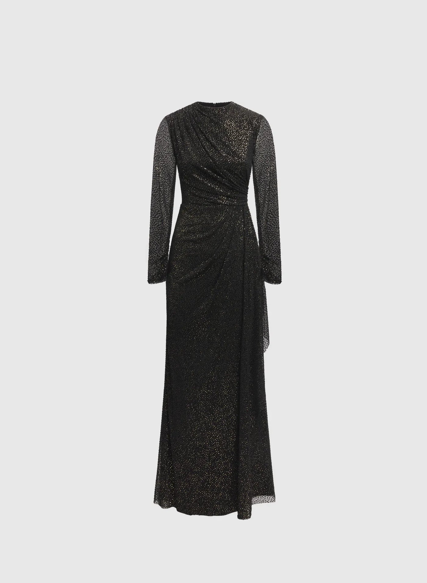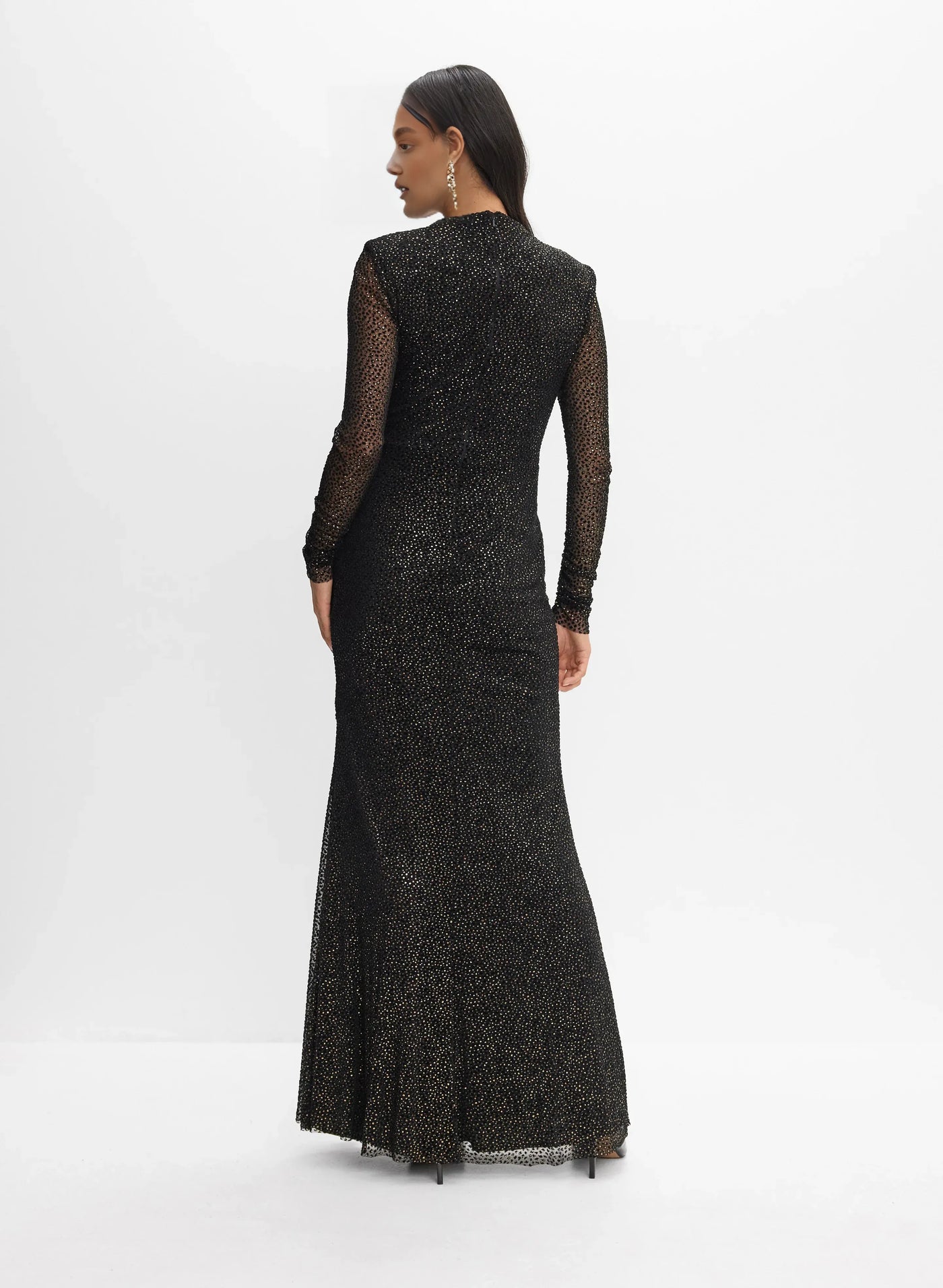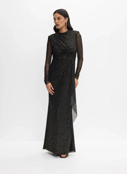 weitese's Elevate your red-carpet allure with this black glitter draped long sleeve gown. It features shimmering glitter fabric with a draped bodice and long sleeves for opulent charm, a mock neckline and fitted silhouette for refined elegance, and a flowing skirt that adds a touch of glamorous flair. The sleek black hue ensures a captivating finish, making it perfect for formal events, award ceremonies, or any occasion where you want to embrace bold luxury with polished, show-stopping style.