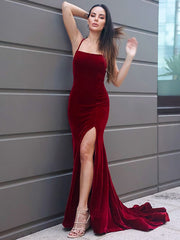 Sheath/Column Velvet Ruched Spaghetti Straps Sleeveless Sweep/Brush Train Dresses