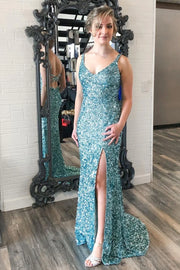 Weitese Backless Light Blue Sequin Mermaid Long Prom Dress with Slit Prom Dress Prom Dresses Stores