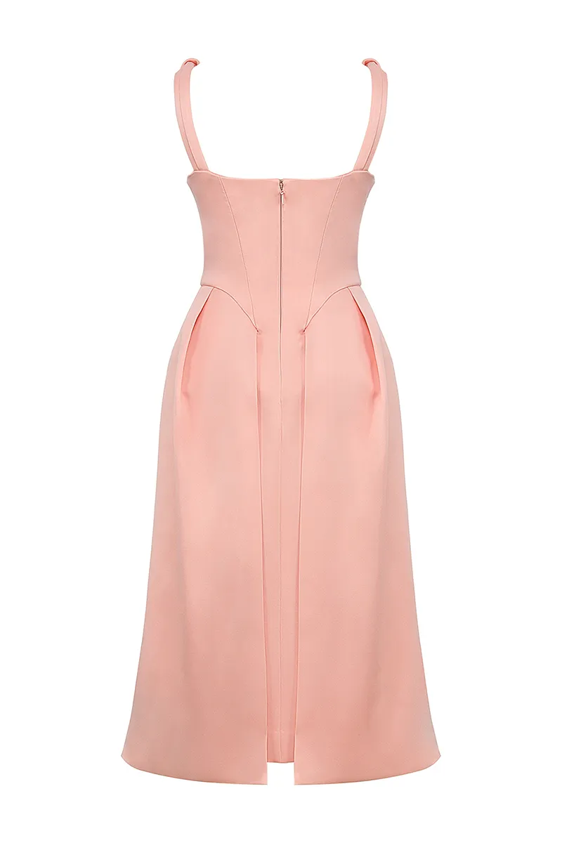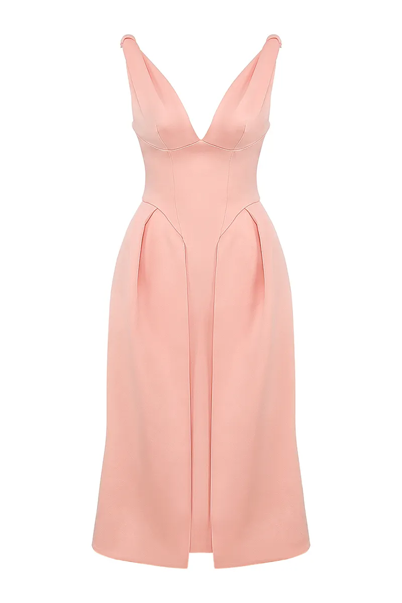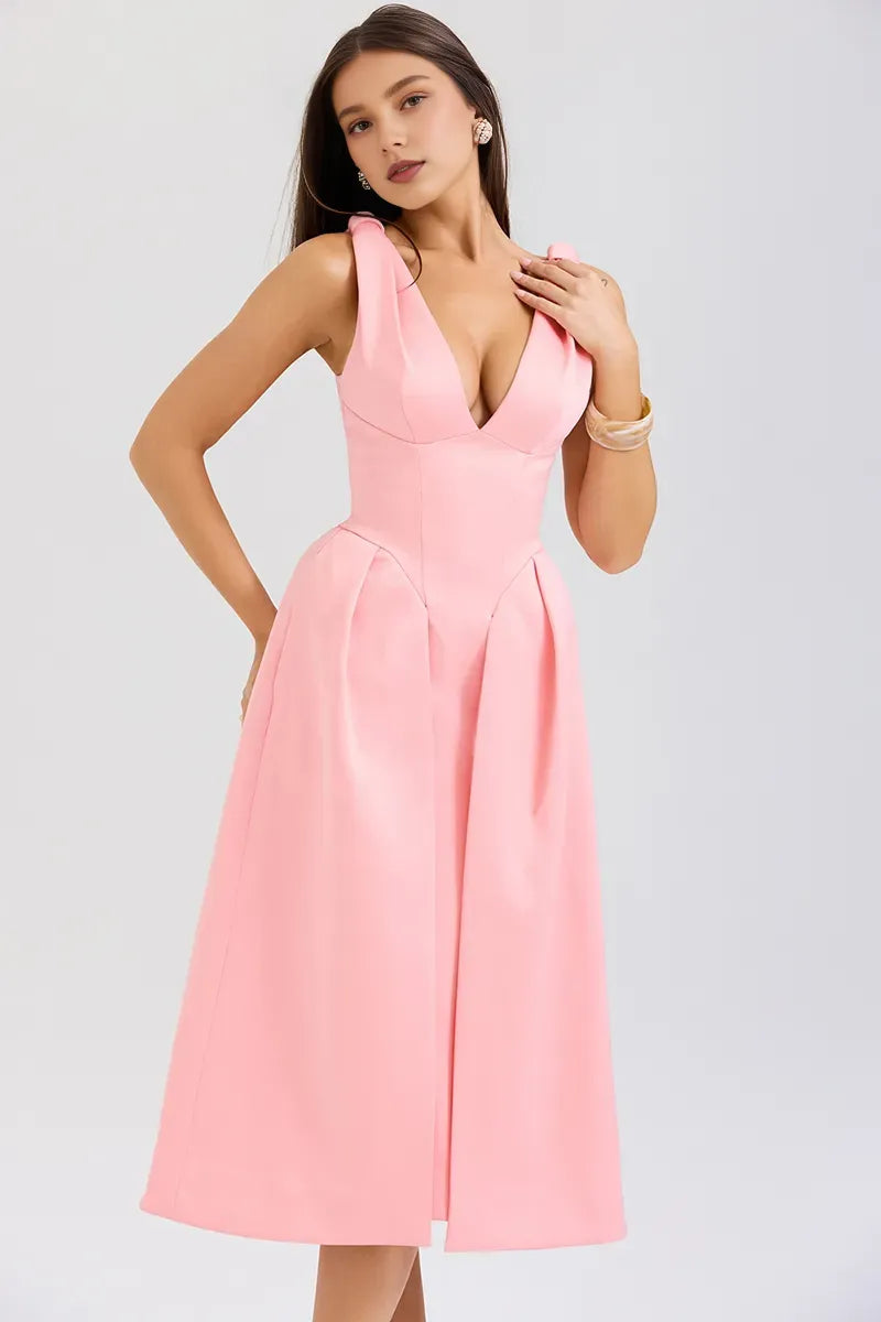 Weitese Dress A-Line/Princess Simple Deep V Neck Cinch Waist Satin Midi Prom Dresses Pink