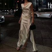 Weitese Dress Elegant V-neck Sleeveless Satin Party Dress Women Sexy Split Hollow Solid Evening Dress Fashion High Waist Draped Long Dresses