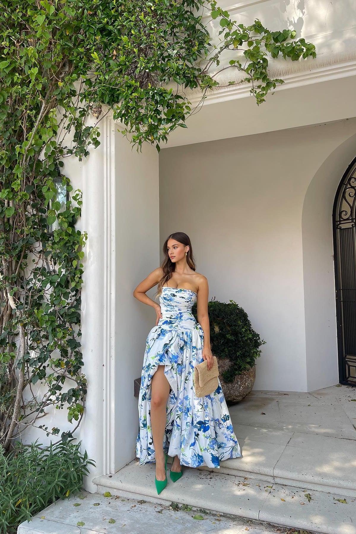 Introducing the Weitese Dress Princess A Line Strapless Blue Printed High-Low Party Dress with Ruffles Prom Dress. This elegant dress features a beautiful blue print, a flattering A-line silhouette, and delicate ruffles for added charm. Perfect for any special occasion, this dress will make you feel like a true princess.