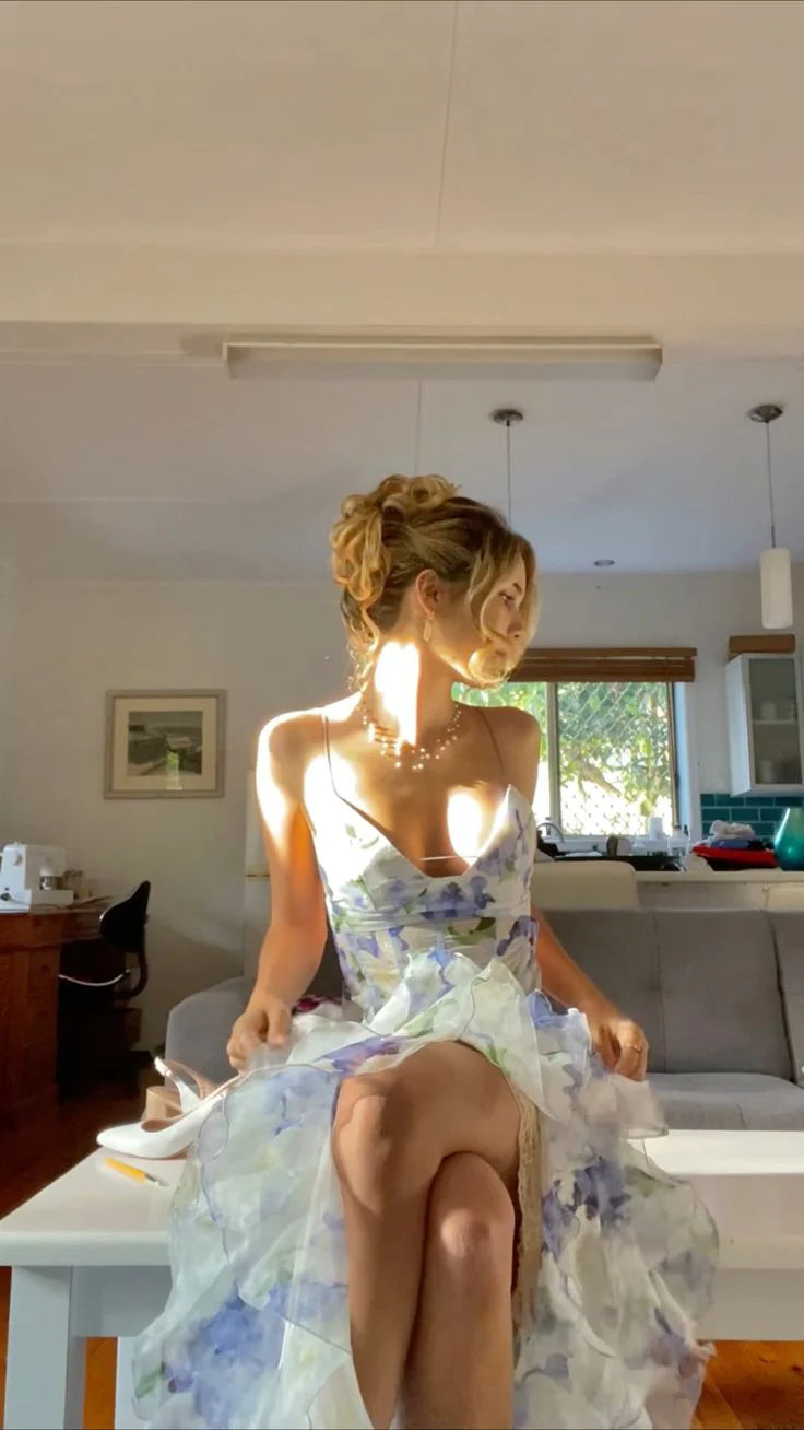 Weitese Dress Retro Sheath Spaghetti Straps Floral Blue Slit Chiffon Long Party Dress Prom Dresses
