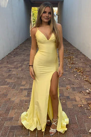 Weitese Dress Simple & Casual Mermaid V Neck Straps Sleeveless Criss Cross Straps Floor Length Wedding Guest Dress Prom Party Gown with Train - Yellow / US 2 / UK 6 / EU 32