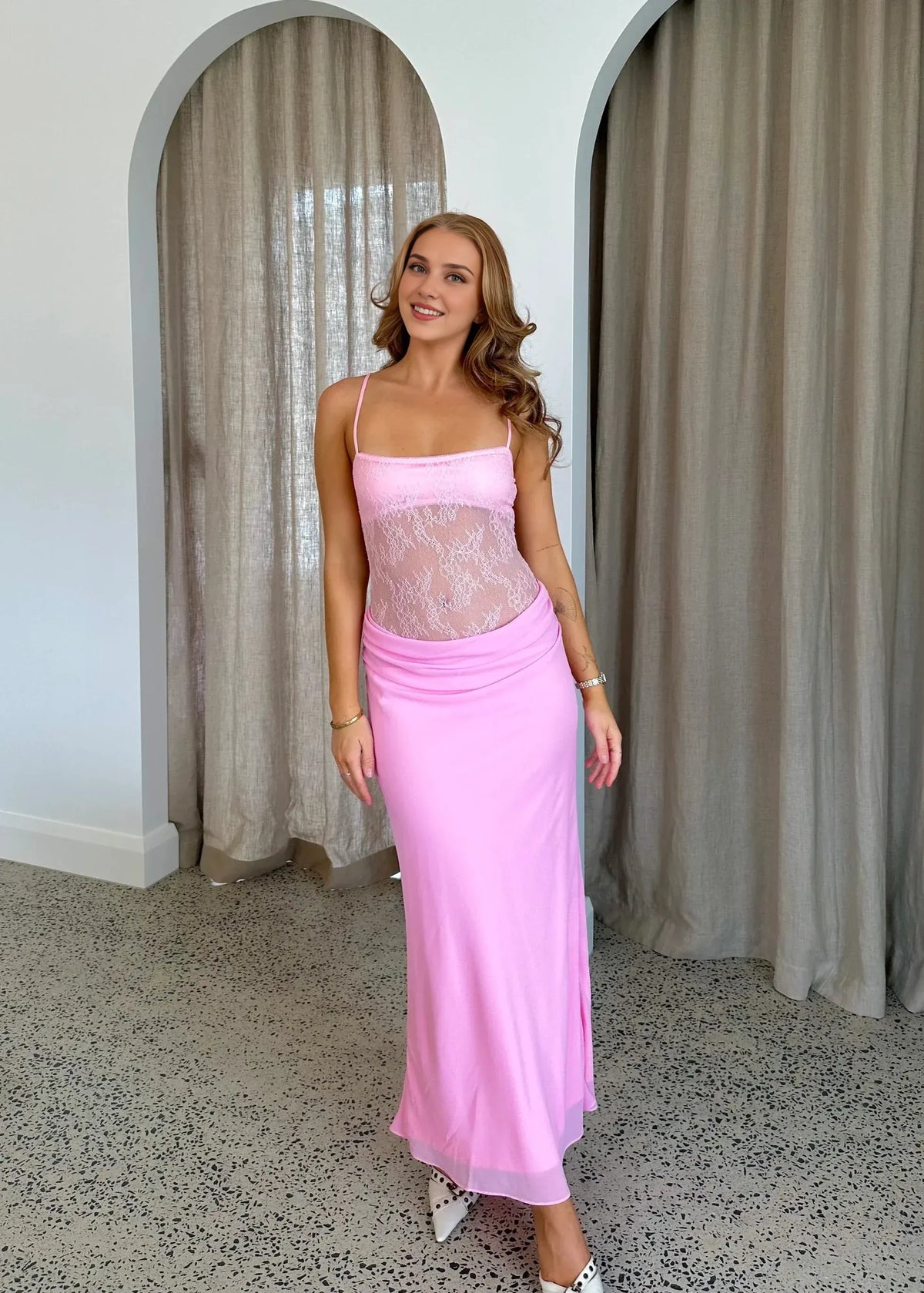 Weitese Dress Spaghetti Straps Maxi Dress Pink Summer Vacation Sleeveless Lace Waist Prom Dress - US 2 / UK 6 / EU 32