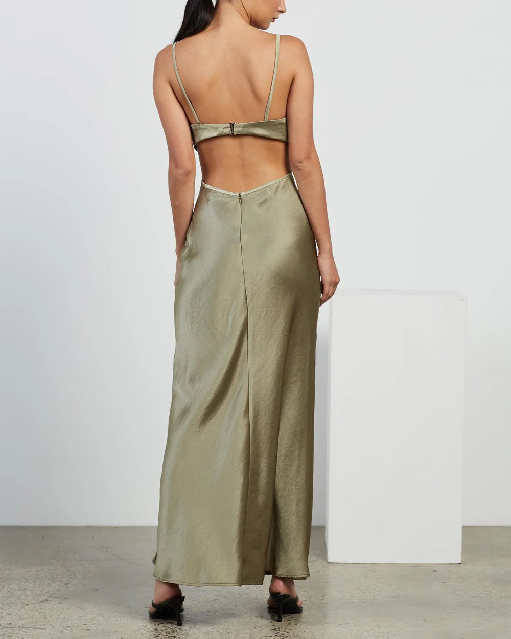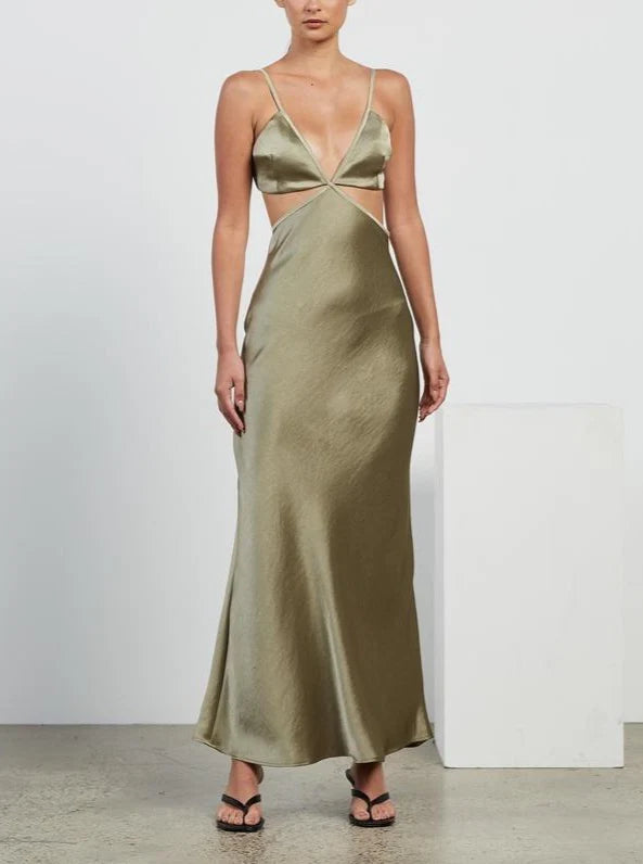 Experience maximum comfort and style with our Weitese Dress. Featuring spaghetti straps, a V-neck cutout waist, and a maxi length, this sage summer vacation dress is perfect for any occasion. The sleeveless design adds a touch of elegance to this must-have prom dress.