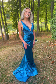 Weitese Sleeveless Pleated Plunge Blue Satin Ruched Mermaid Party Dress Prom Dress Prom Dresses Stores