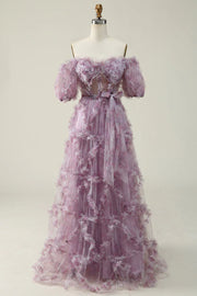 A Line Off The Shoulder Purple Ruffles Vintage Prom Dress