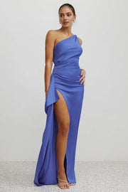 weitese's Elevate your formal style with this blue one-shoulder satin maxi dress. It features a chic one-shoulder neckline, a crystal-embellished strap at the back that adds opulence, and a high slit that offers movement and allure. Crafted from luxurious satin fabric, this dress exudes bold elegance and is perfect for galas, red carpet events, or any upscale occasion. The vibrant blue hue and eye-catching design make it a standout choice, ideal for pairing with diamond jewelry and strappy heels to complete a refined ensemble.