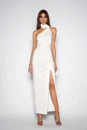 weitese's Elevate your formal style with this white satin one-shoulder maxi dress. It features a sophisticated one-shoulder neckline with a draped neck detail for added elegance, a high slit that offers allure and movement, and a figure-hugging silhouette that accentuates curves. Crafted from luxurious satin fabric, this dress exudes timeless sophistication and is perfect for red carpet events, galas, or any upscale occasion. The crisp white hue and dramatic design make it a standout choice, ideal for pairing with diamond jewelry and strappy heels to complete a refined ensemble.
