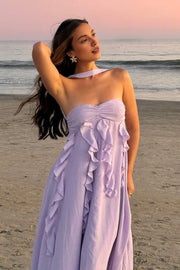 weitese's Elevate your beachside elegance with this lilac one-shoulder ruffled maxi dress. It features flowy fabric with dramatic ruffled detailing for opulent allure, a unique one-shoulder neckline for refined charm, and a lace-up back design for sophisticated flair. The soft lilac hue ensures a dreamy finish, making it perfect for beach events, summer galas, or any occasion where you want to embrace whimsical luxury with polished, red-carpet-worthy style.