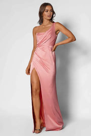 weitese's Elevate your formal style with this pink satin one-shoulder maxi dress. It features a sophisticated one-shoulder neckline, a draped bodice that adds subtle elegance, and a high slit that offers allure and movement. Crafted from luxurious satin fabric, this dress exudes timeless sophistication and is perfect for red carpet events, galas, or any upscale occasion. The soft pink hue and dramatic design make it a standout choice, ideal for pairing with diamond jewelry and strappy heels to complete a refined ensemble.