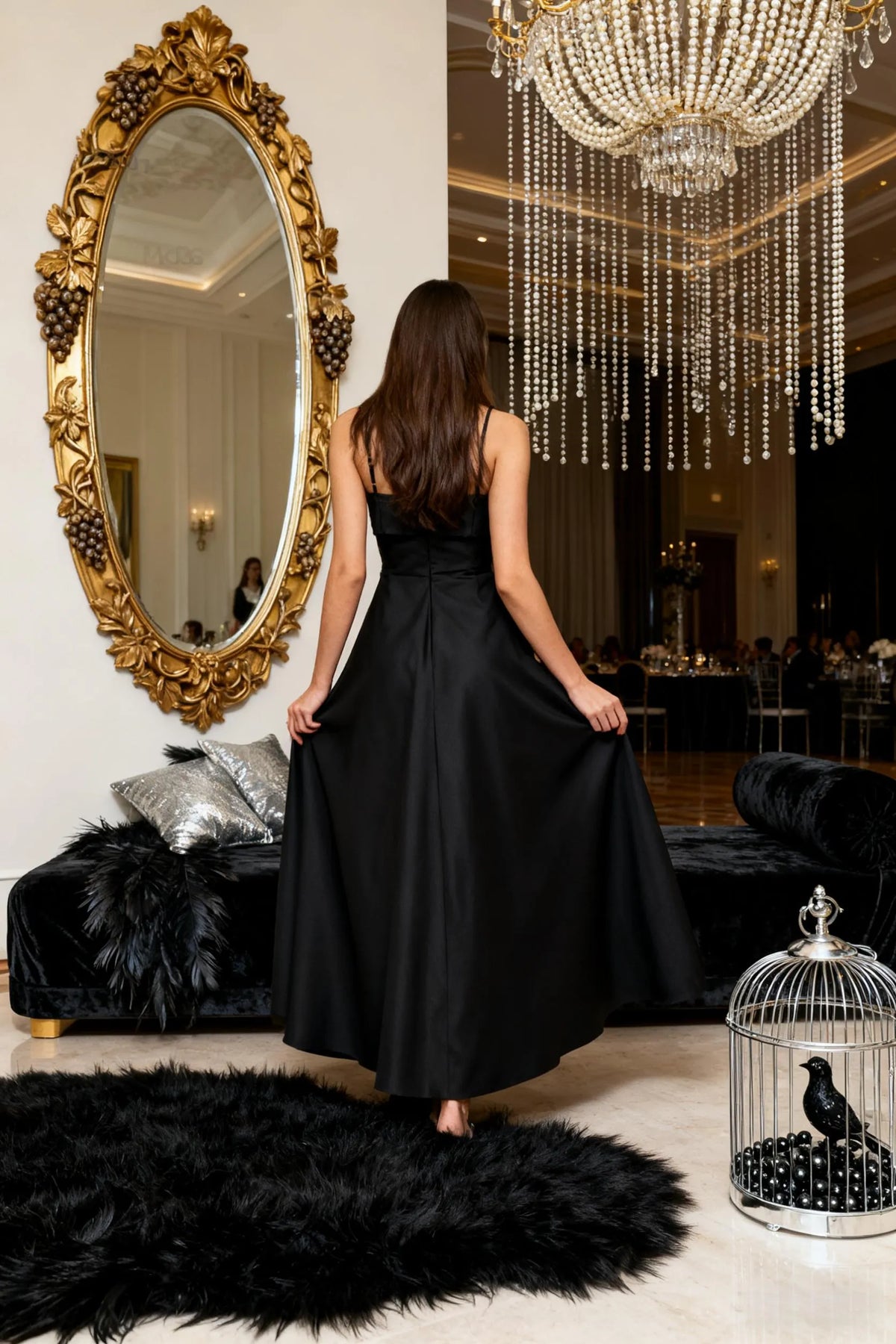 weitese's black satin floor-length gown features delicate spaghetti straps, a flowing A-line skirt, and a minimalist silhouette. The smooth satin fabric exudes understated luxury, making it ideal for black-tie events, formal galas, or elegant evening weddings—combines timeless monochrome with refined, versatile design.