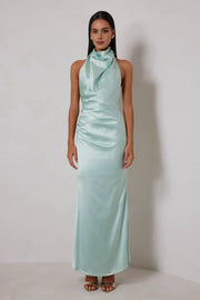 weitese's Elevate your formal style with this mint green satin halter maxi dress. It features a luxurious satin fabric with a draped halter neckline that adds sophistication, a figure-hugging silhouette, and an alluring open back design. Perfect for red carpet events, weddings, or any high-end occasion, this dress combines glamour and comfort seamlessly. Pair it with metallic heels and statement earrings to complete a showstopping ensemble.